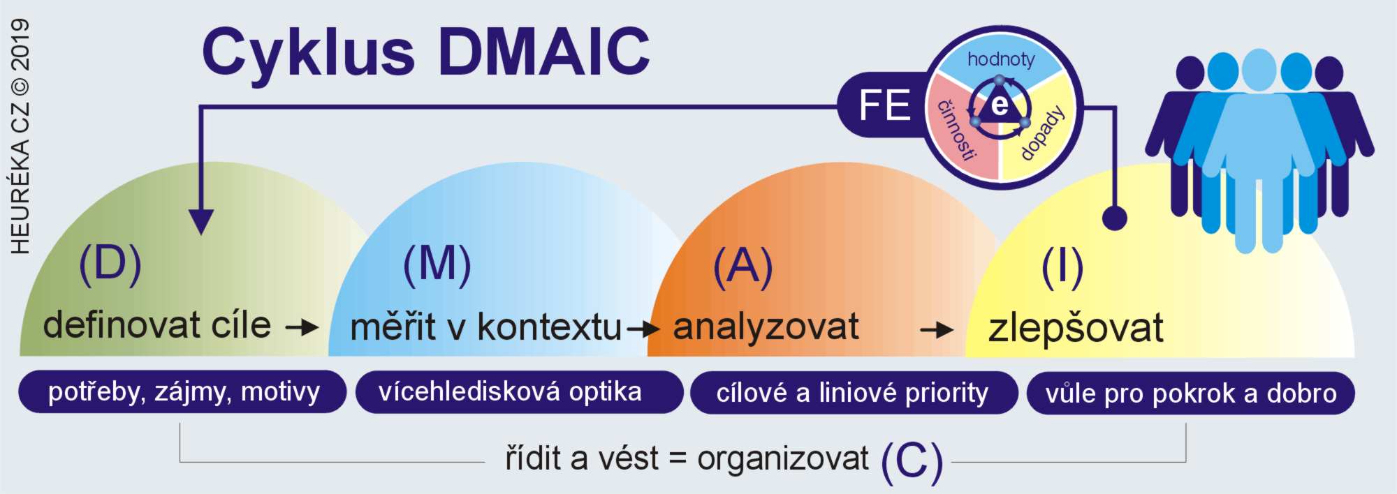 Cyklus DMAIC služebně kopíruje cyklus PDCA, kde plánujeme, realizujeme, hodnotíme a vyhodnocujeme, co bychom mohli zlepšovat.